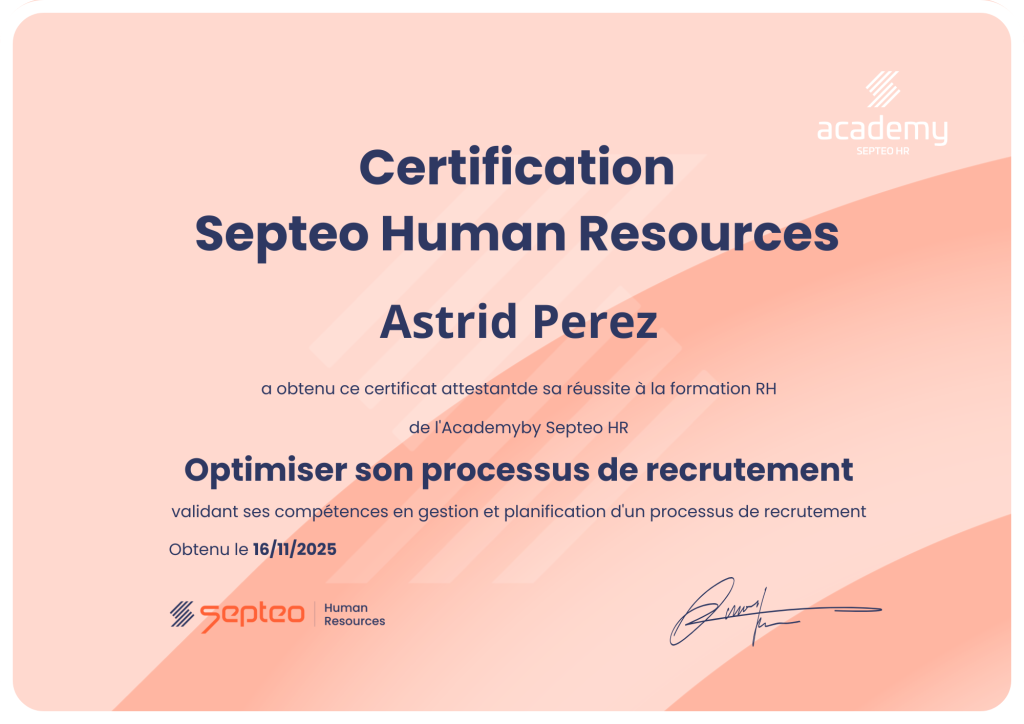 Avec la HR Academy, vous accédez à des formations claires, concrètes et directement applicables. Chaque module s’adapte à votre rythme et à vos besoins, qu’il s’agisse de perfectionner l’usage de vos logiciels Septeo HR ou d’explorer de nouvelles pratiques RH. À la clé, des certifications valorisantes qui attestent de vos compétences et renforcent votre crédibilité auprès de vos équipes, de vos collaborateurs et de vos partenaires.